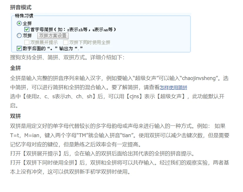 为了避免这种情况,我当时使用了「搜狗输入法」,它的双拼设置中有一个选项在开启后可以在「使用双拼的时候也可以使用全拼」,类似以前我看到过的智能五笔中的五笔、全拼混合使用。