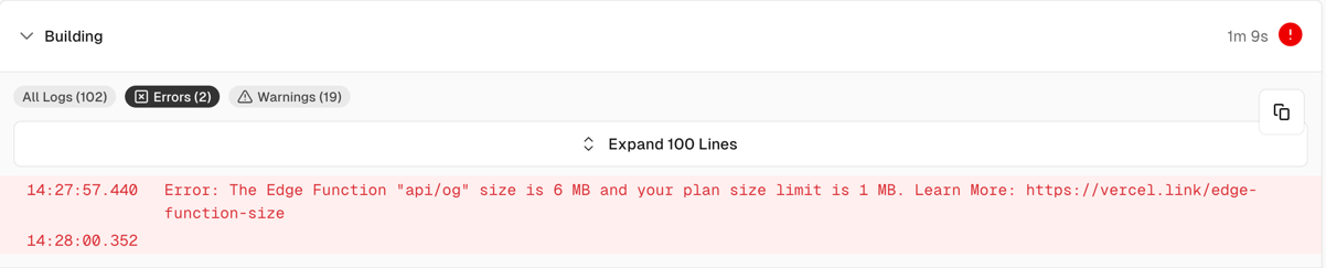 这是因为部署时,Vercel 会将字体文件复制到 Edge Function 的运行环境中,免费版的 Edge Function 的运行环境只有 1MB,而 Mi Sans 字体压缩后也会超过 5M,所以会报错。