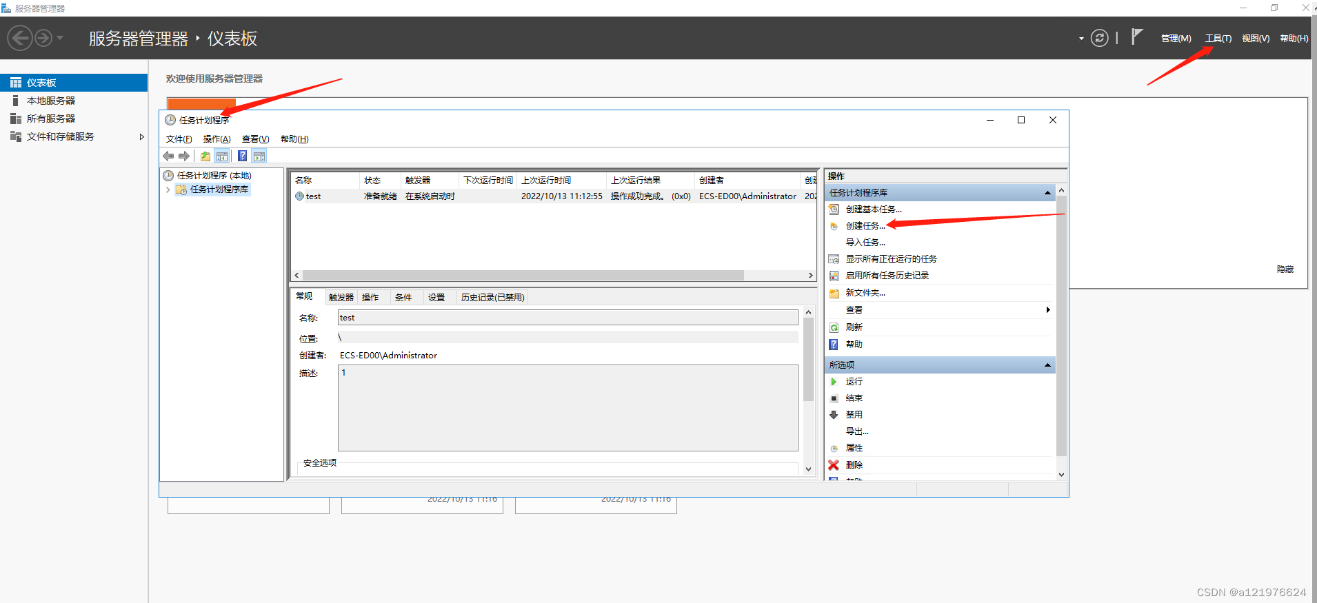 服务器管理器 ~> 工具(右上角) ~> 任务计划程序 ~> 创建任务****