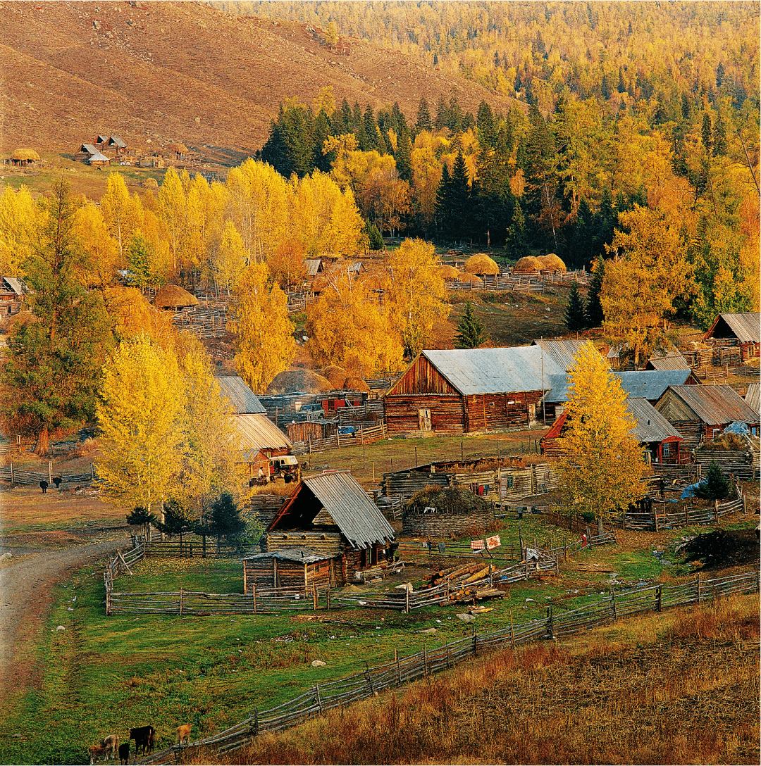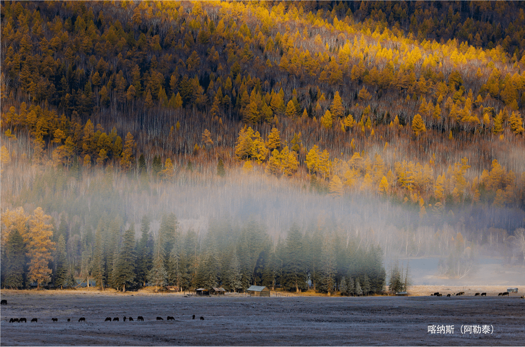 秋天的喀纳斯,金色的白桦林、金色的牧场田野、金色的草地、金色的村庄、金色的晨曦,牧人转场时扬起的尘土都是金色的,夺目的金光闪闪铺陈开来。